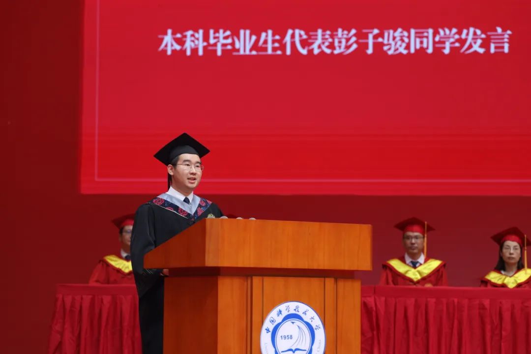 2024年5月16日,中国科学技术大学第43届郭沫若奖学金颁奖典礼在东区大礼堂举行。今年一共有35名学生获此奖项。来自化学与材料科学学院的彭子骏同学正是其中的一员。同时,他也作为本科毕业生代表,在中国科学技术大学2024年毕业典礼暨学位着装授予仪式上进行毕业发言。