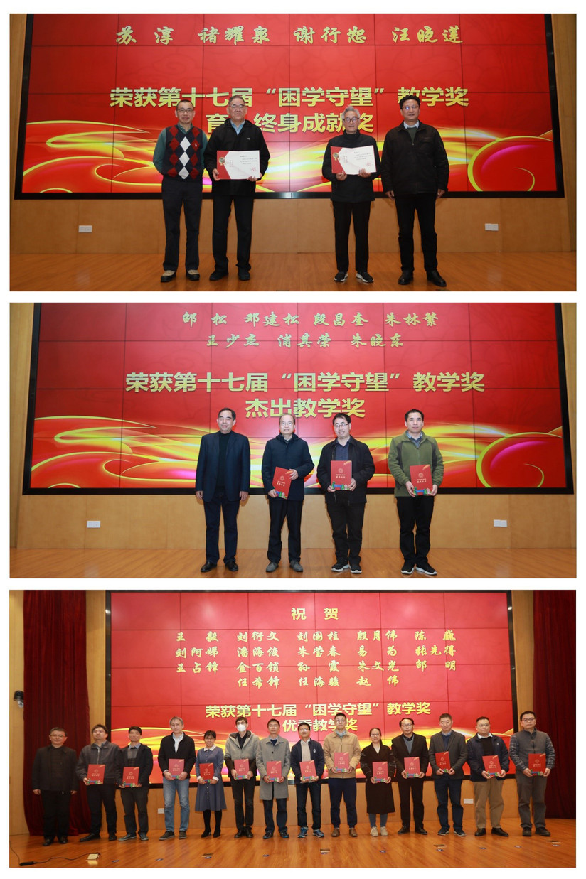陈卫东宣读了第十七届“困学守望”教学奖获奖名单。苏淳、褚耀泉、谢行恕、汪晓莲等4位老师荣获育人终身成就奖;邵松、邓建松、段昌奎、朱林繁、王少杰、浦其荣、朱晓东等7位老师荣获杰出教学奖;王毅、刘衍文、刘国柱、殷月伟、陈巍、刘阿娣、潘海俊、朱莹春、易为、张先得、王占锋、金百锁、孙霞、朱文光、邵明、任希锋、任海骏、赵伟等18位老师优秀教学奖。蒋一、陈卫东、刘万东分别为获奖教师颁奖。