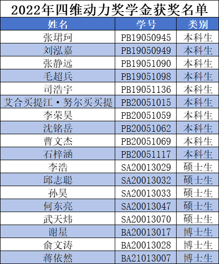 2022年“四维动力奖学金”评选已经结束。由学生本人申请和导师推荐,系、院学生奖学金评审小组及校学生专项奖学金评审委员会评审和批准,中国科大工程科学学院共有18人获得该奖。名单如下: