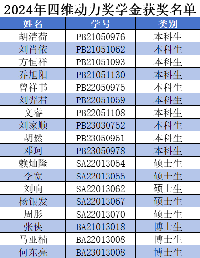 2024年“四维动力奖学金”评选已经结束。由学生本人申请和导师推荐,系、院学生奖学金评审小组及校学生专项奖学金评审委员会评审和批准,中国科大工程科学学院共有18人获得该奖。名单如下: