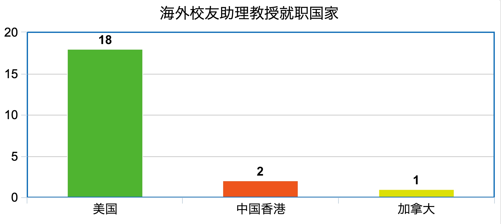 据不完全统计,有18位校友在美国高校获得助理教授岗位,中国香港有2位,加拿大有1位。