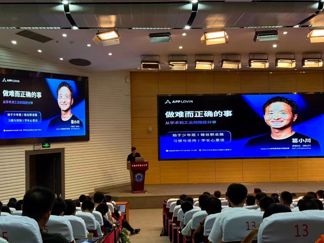 9月17日(周三),AppLovin全球高级技术副总裁葛小川(05少)回到中国科大东区给大家做《做难而正确的事:从学术到工业的路径分享》座谈会,以下是他的发言:
