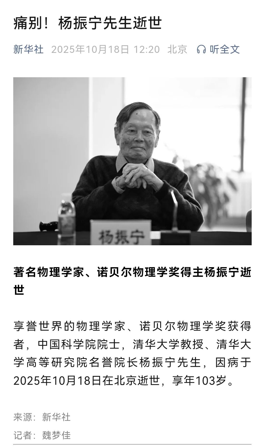 新华社10月18日12:20消息:杨振宁先生逝世。