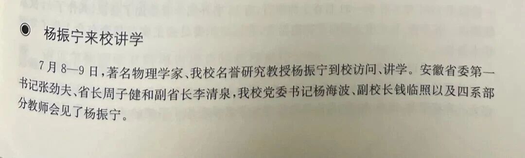 · 1981年7月8-9日,杨振宁到校访问、讲学。安徽省委第一书记张劲夫、省长周子健和副省长李清泉,我校党委书记杨海波、副校长钱临照以及四系部分教师会见了杨振宁;杨振宁与科大少年班学生座谈。