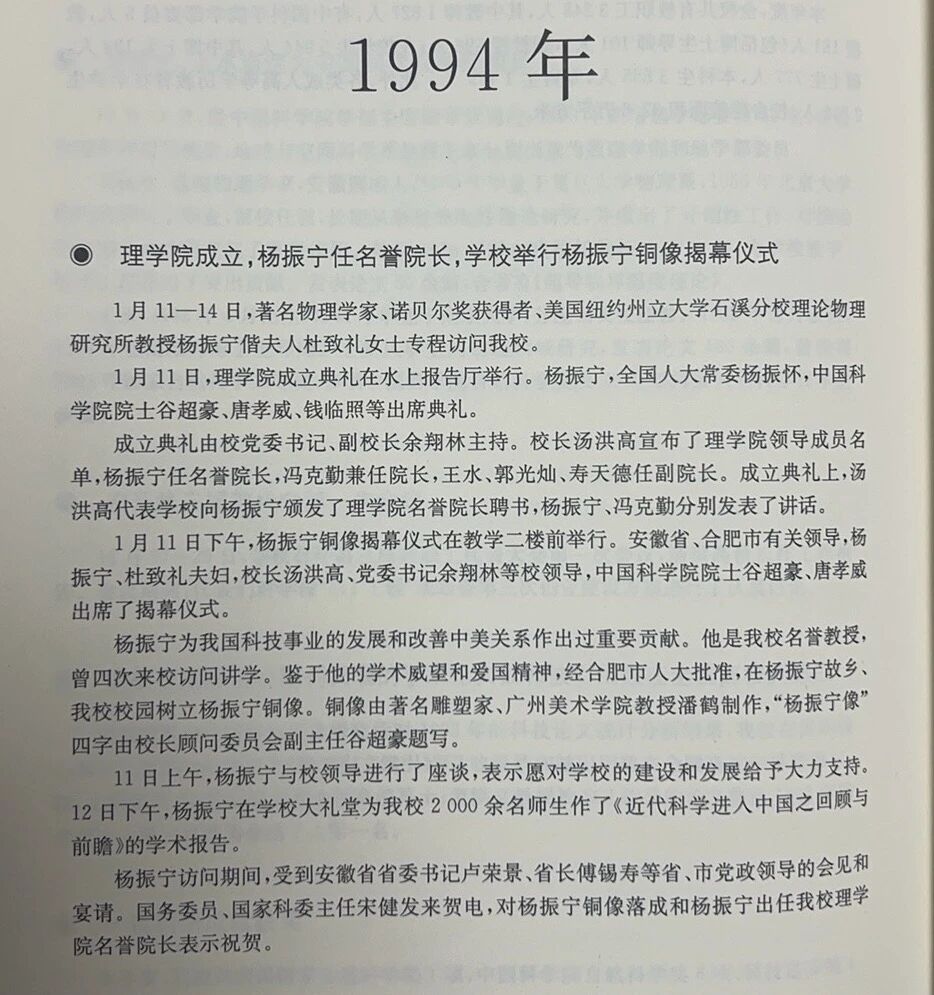· 1994年1月11日下午,杨振宁铜像揭幕仪式在教学二楼前举行。安徽省、合肥市有关领导,杨振宁、杜致礼夫妇,校长汤洪高、党委书记余翔林等校领导,中国科学院院士谷超豪、唐孝威出席了揭幕仪式。