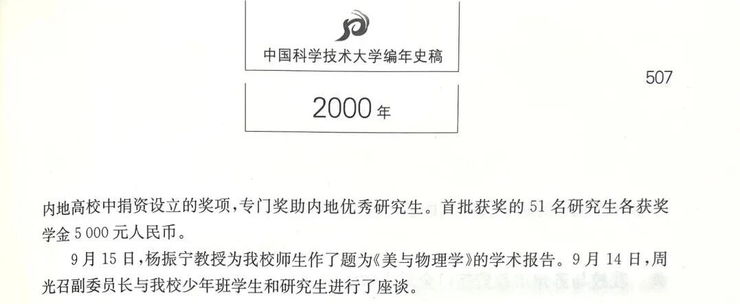 · 2000年9月15日,首届“求是研究生奖学金”颁奖典礼在我校隆重举行,杨振宁出席典礼并致辞。