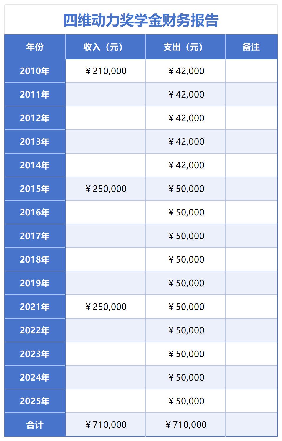 项目始于2010年10月,截至2025年,四维动力已成功签约并资助三期四维动力奖学金(每期五年),累计捐赠71万元(第一期21万、第二期25万、第三期25万),共资助学生235名(第一期55名、第二期90名、第三期90名)。