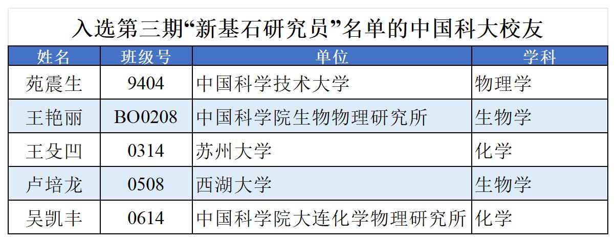 11月24日上午,第三期“新基石研究员项目”获资助名单公布,据新创校友基金会不完全统计,中国科学技术大学共有5位校友入选:
