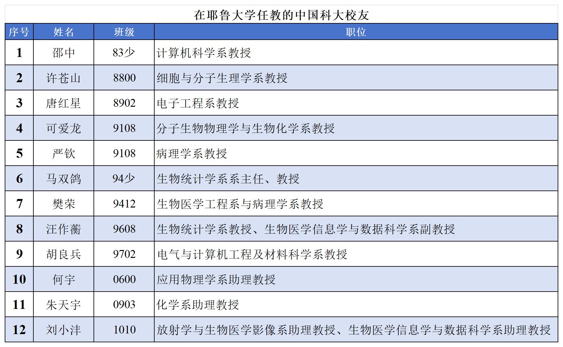 据民间、独立的新创校友基金会不完全统计。至少如下12位中国科学技术大学校友在耶鲁大学任教,分布在计算机、电子工程、生命医学、生物统计学、物理与化学等多个学科。如有遗漏,欢迎补充。更多中国科大学子在境外研究型大学任教的情况,详见本文末尾。