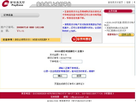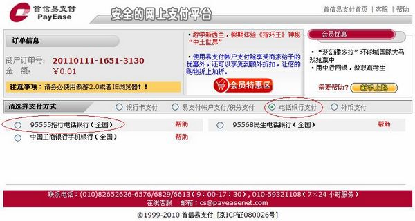 3、进入首信易支付平台,选择电话银行支付,再选择95555招行电话银行(全国),页面如下