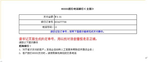 5、进入如下页面,稍等几秒钟后,接听招行客服电话,按电话语音的操作提示进行支付(注:如未接到招行客服电话,请致电95555进行咨询支付即可。)