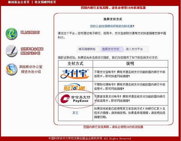 1、进入校友在线捐赠系统,填写好捐赠表格后选择首信易支付方式,页面如下